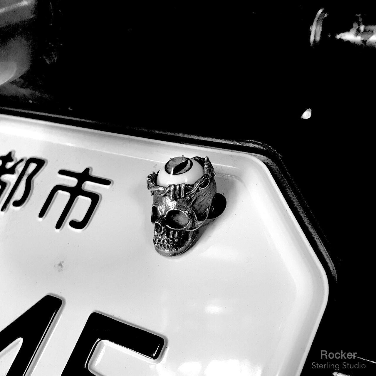 パンキッシュなスカルにアクリル製のキャッツアイをセットした、シルバー製のライセンスボルトになります。