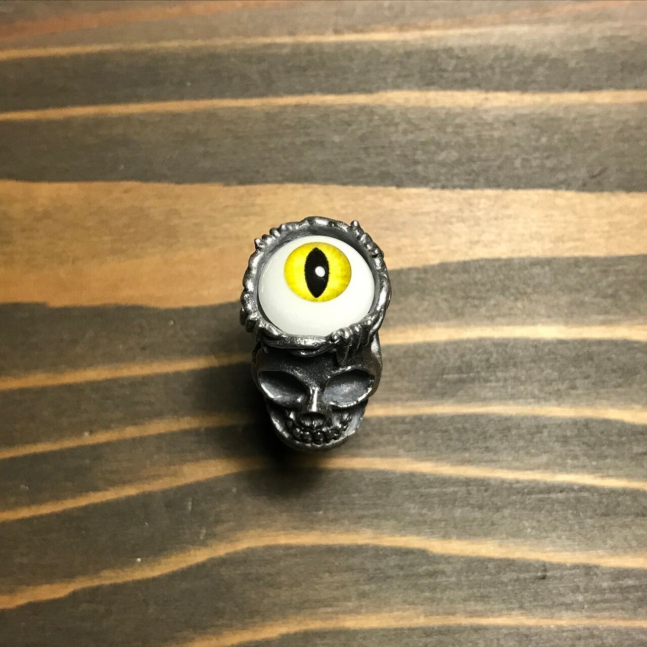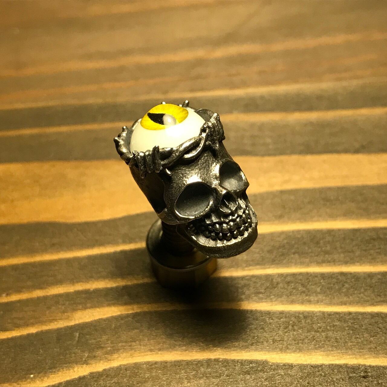 パンキッシュなスカルにアクリル製のキャッツアイをセットした、シルバー製のライセンスボルトになります。