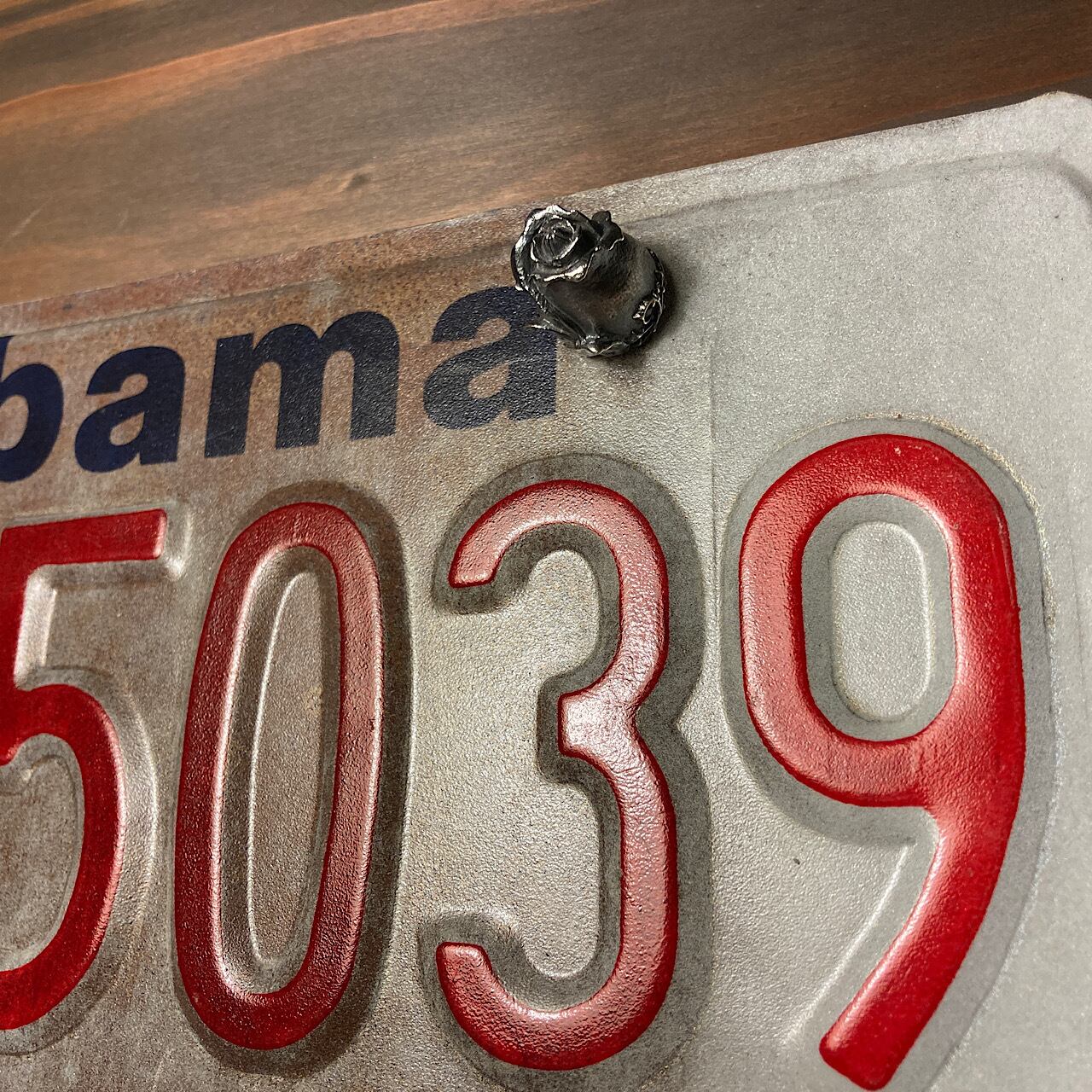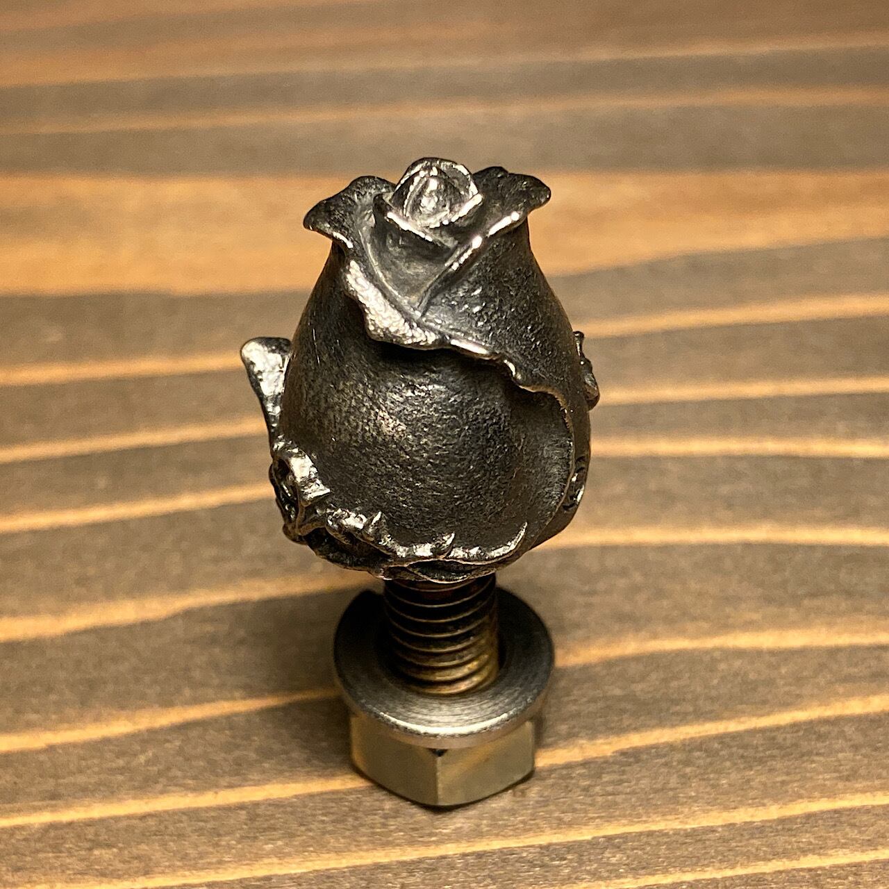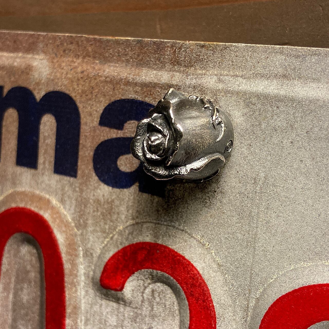 バラの蕾をモチーフにした、シルバー製のライセンスボルトになります。