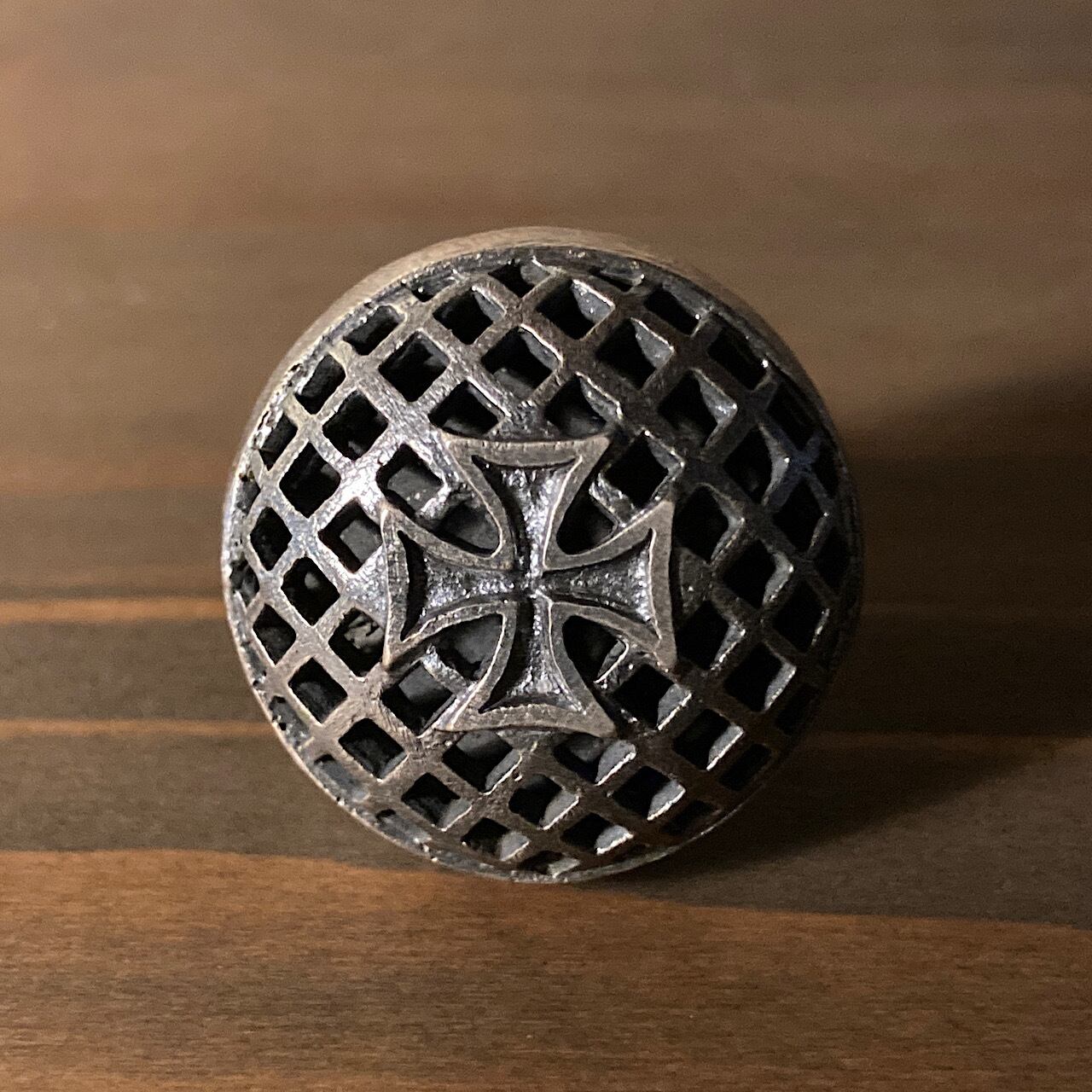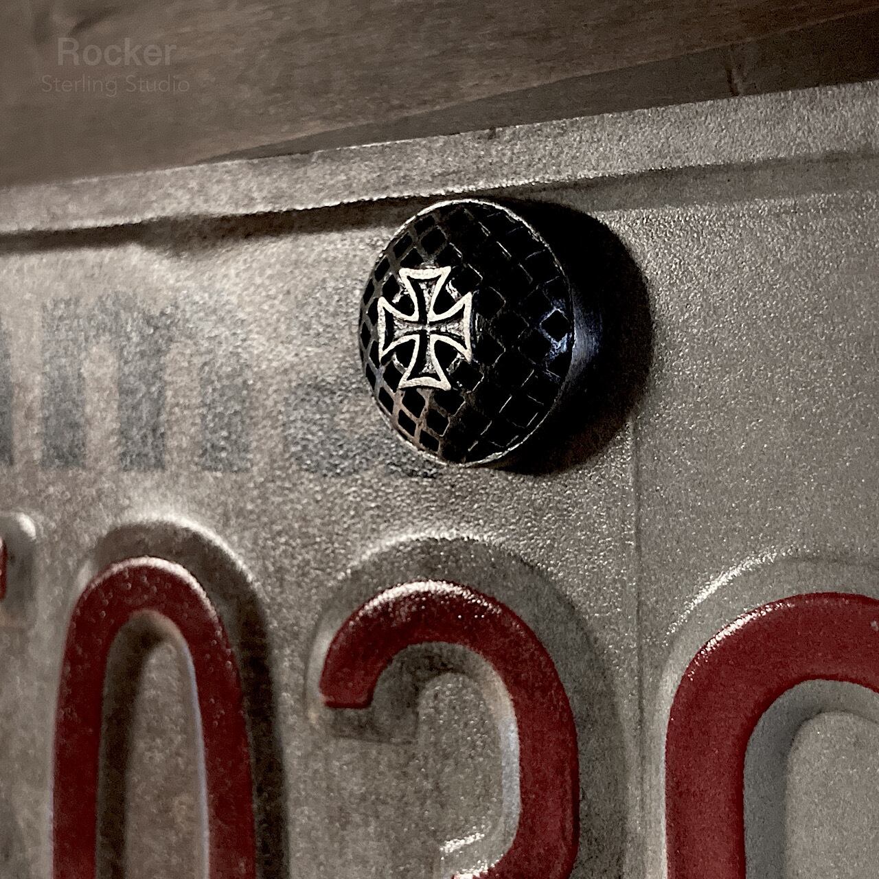 メッシュ加工を施したドーム状の台の中央にアイアンクロスをセットした、シルバー製のライセンスボルトになります。