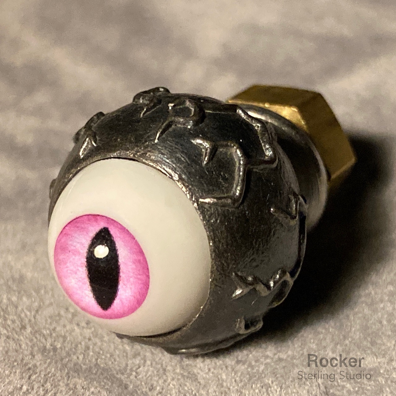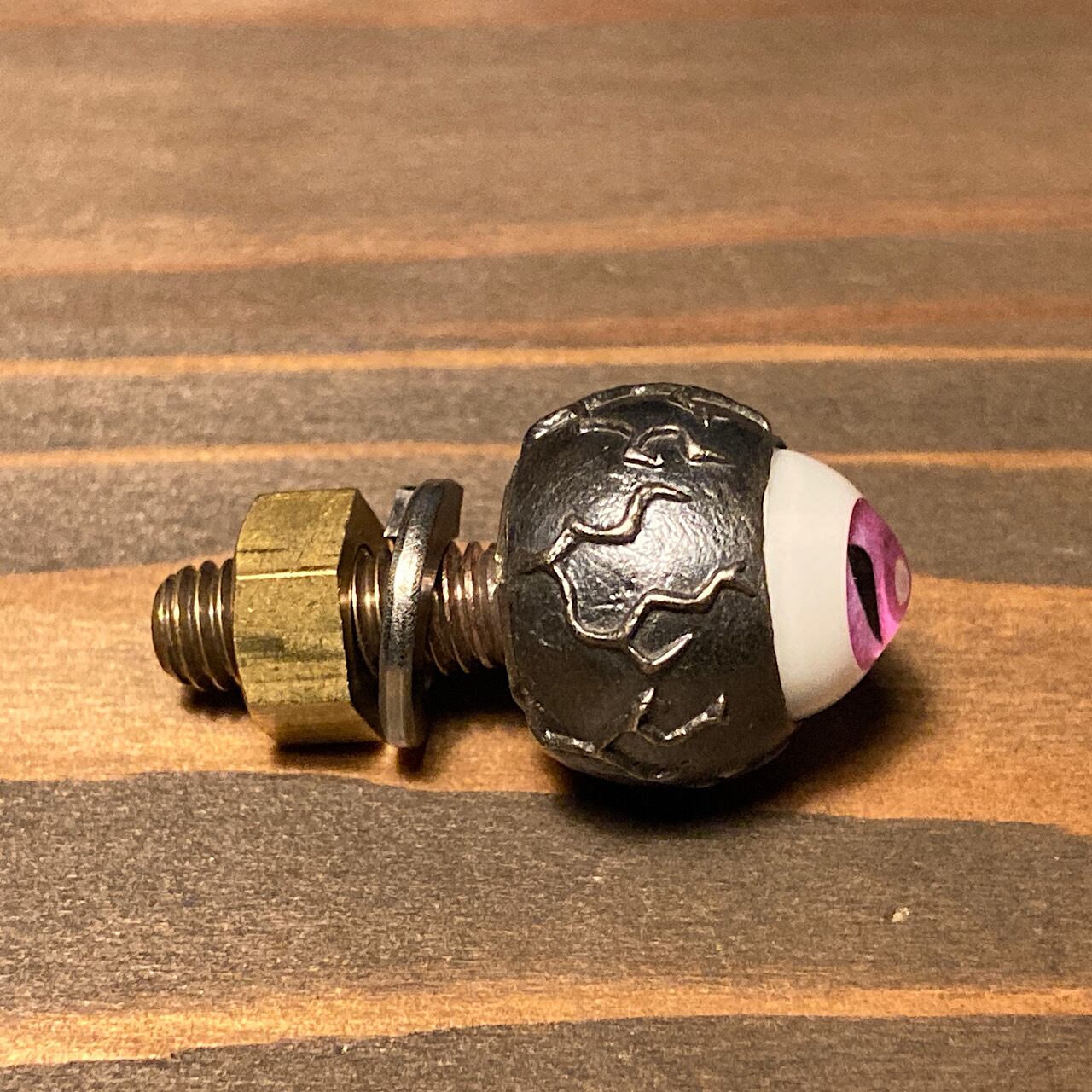 血管を浮かせたヘッドにアクリル製の猫の目玉をセットした、シルバー製のライセンスボルトになります。