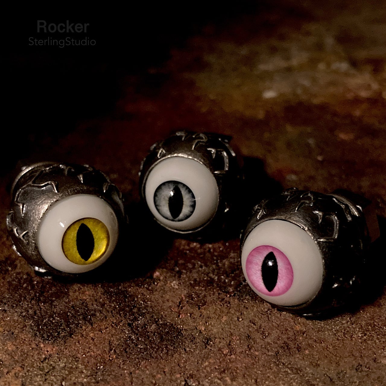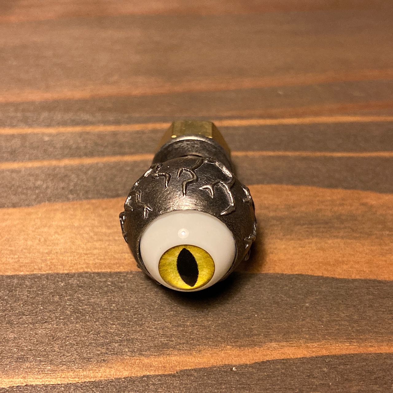 血管を浮かせたヘッドにアクリル製の猫の目玉をセットした、シルバー製のライセンスボルトになります。