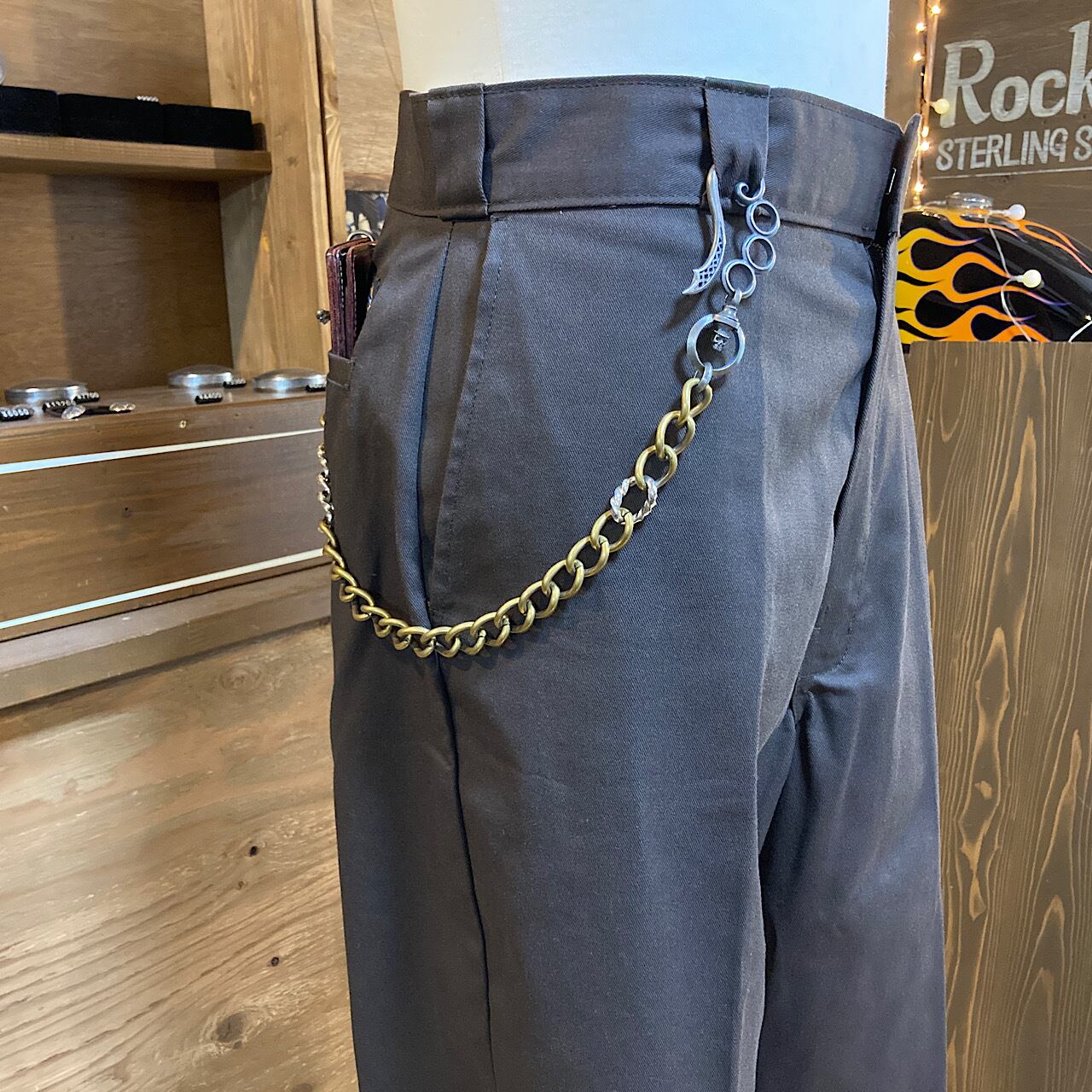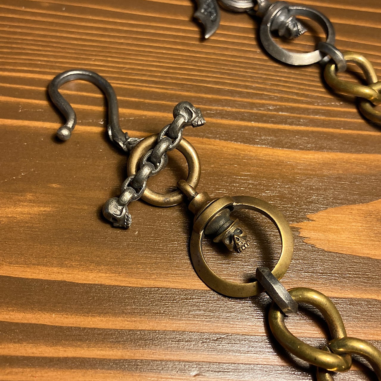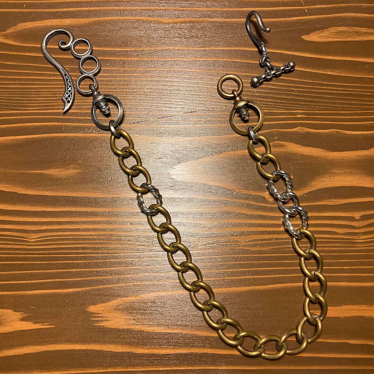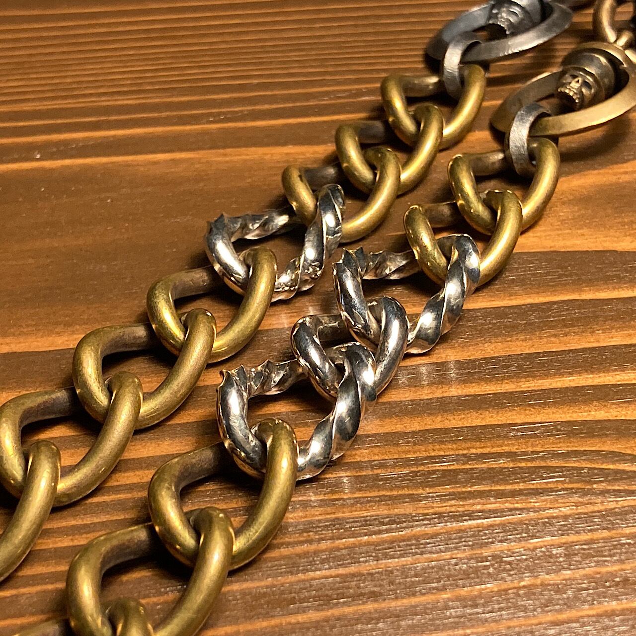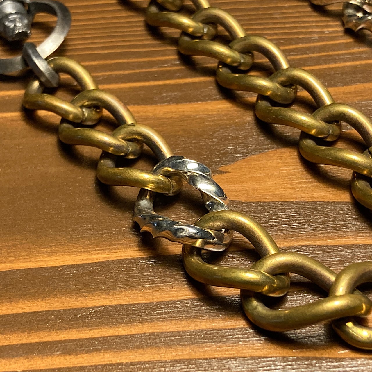 不規則な間隔で並ぶツイストピースが目を引く、シルバーとブラスを組み合わせたウォレットチェーンです。